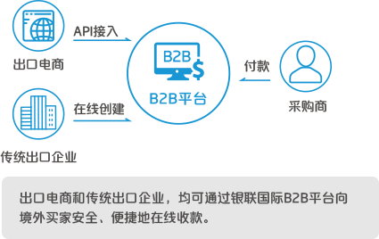 跨境B2B綜合支付服務平臺是銀聯國際爲全球跨境電商、傳統型貿易公司等廣大進出口企業打造的開放式B2B綜合支付服務平臺。平臺提供企業跨境在線支付、在線收款、線上結匯以及電子訂單管理等多方位服務。我們致力於爲企業提供安全、便捷、全天候的服務,依託數字化支付技術,促進中國與全球各國或地區,特別是與“一帶一路”國家之間的貿易發展。