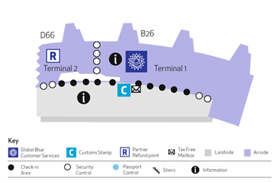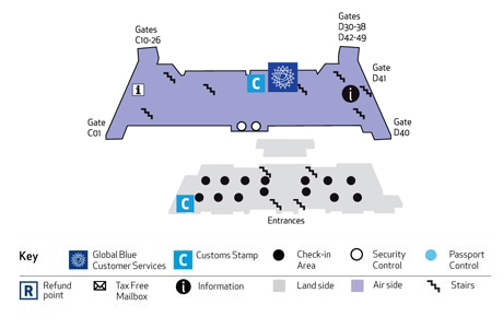 Check-in Luggage Tax Refund Inspection is near Counter A and C Carry-on Luggage Tax Refund Inspection is near Gate 219