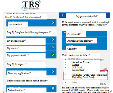 1. Complete the Tax Refund Form on purchase, choose credit card for receiving tax refund and fill in UnionPay card ( card number starting with 62).