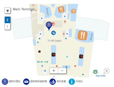 2. Before going through the boarding procedure, please apply to the Customs Office for tax refund by presenting your Tax Refund Form, passport, tax-free goods and sales slip to the Customs Office for inspection and stamping. (Customs Stamp is opposite to the Security Control.)