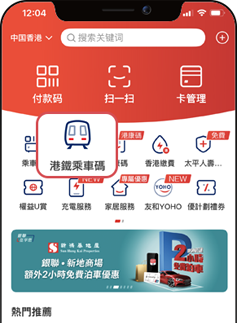 注意:港鐵乘車碼僅適用於香港地鐵,若乘搭巴士或其他交通工具,請點選「乘車碼」使用服務。